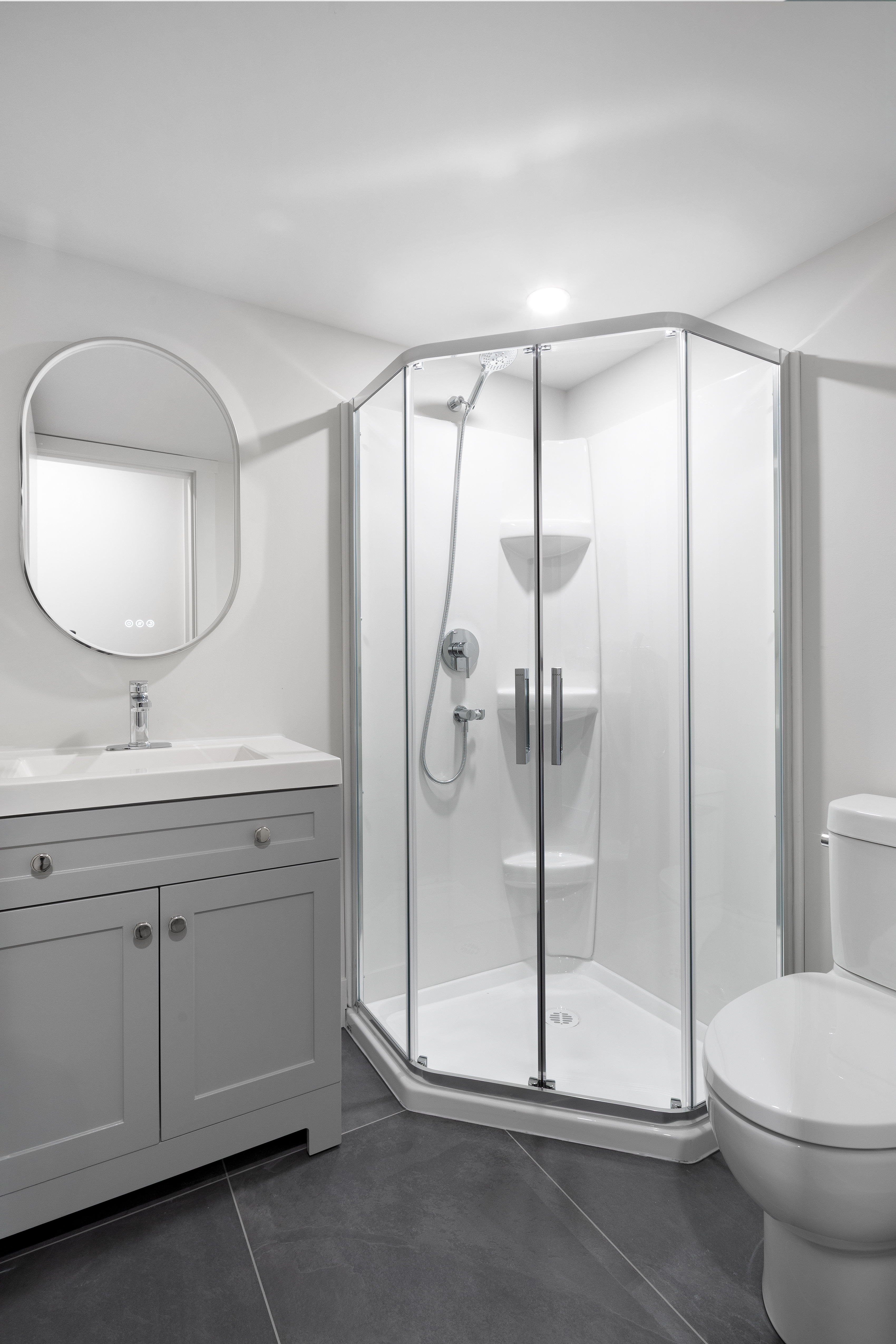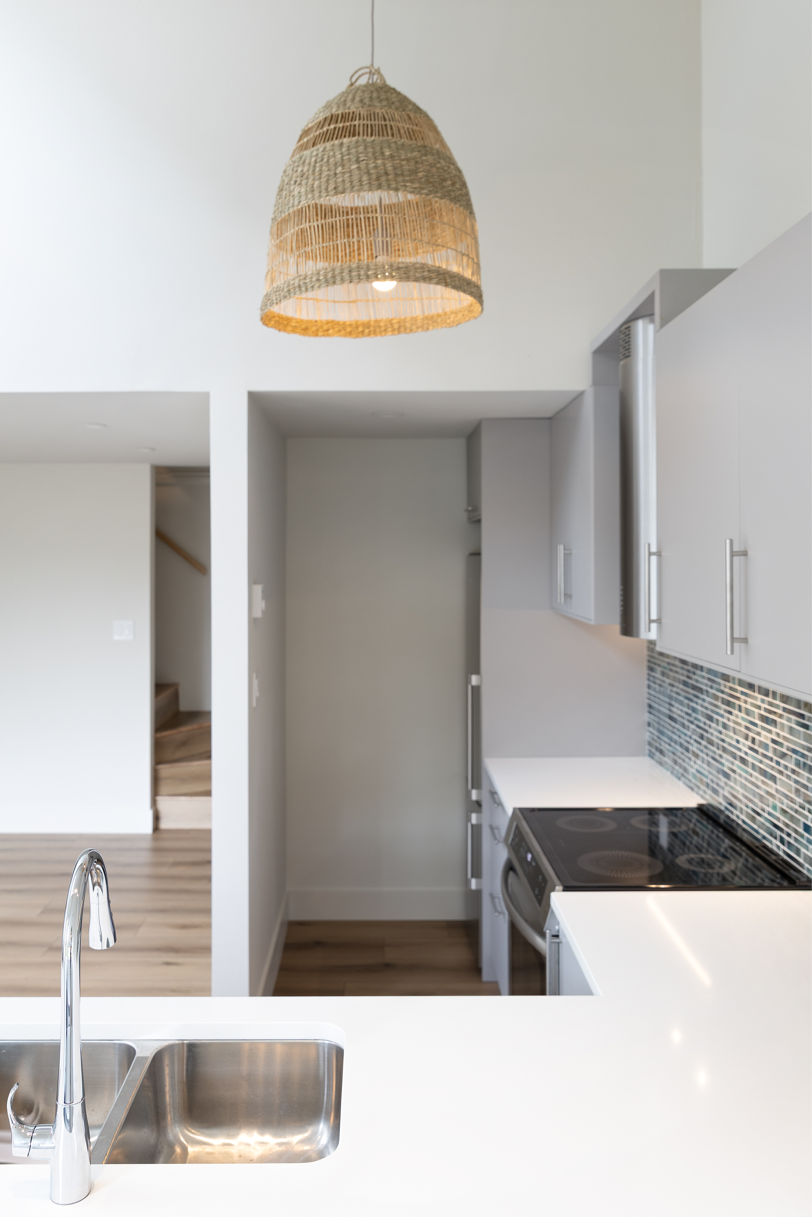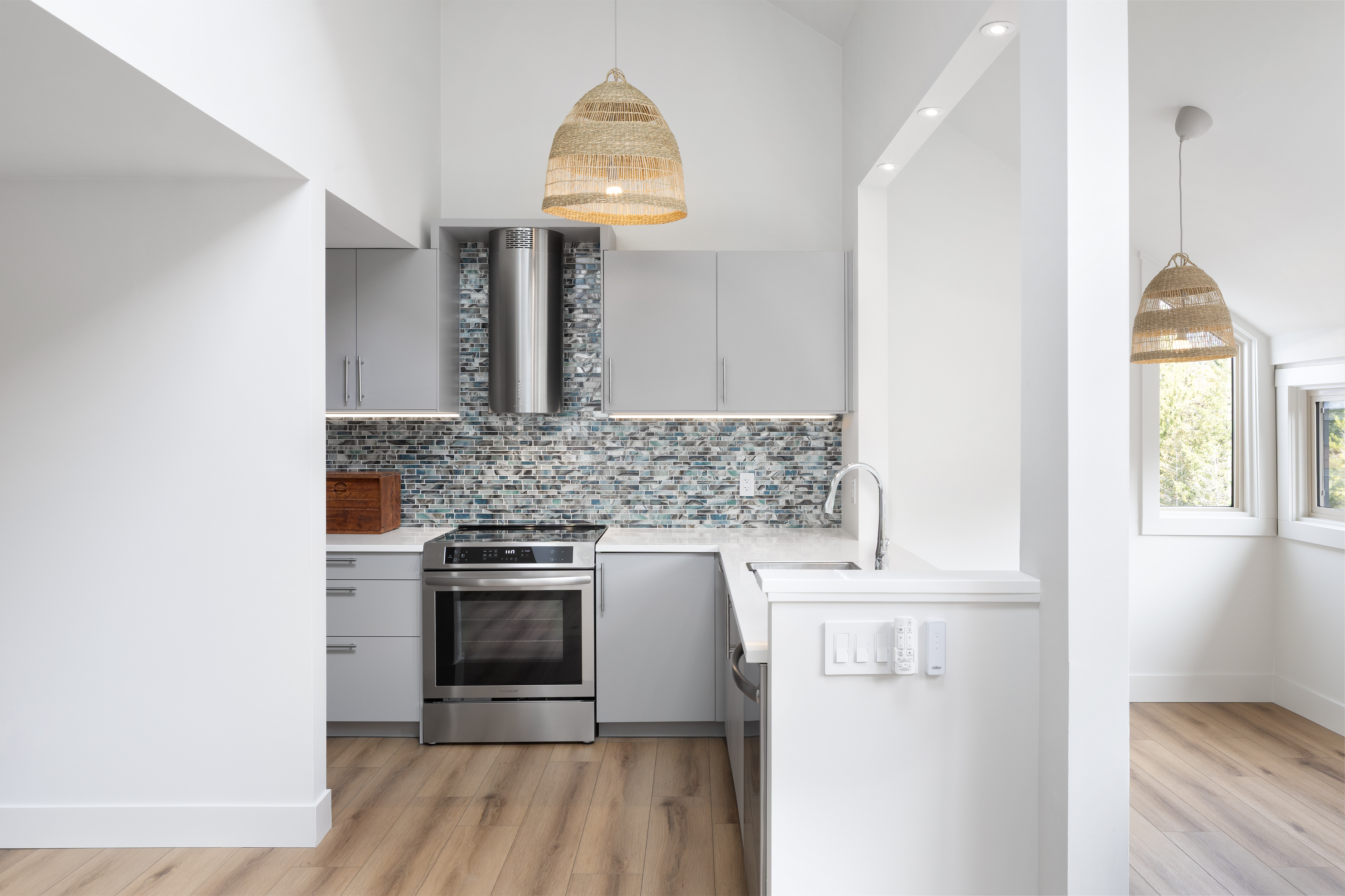 A new IKEA kitchen and bathroom vanities were installed by Schreyer Construction’s in-house team, complemented by quartz countertops, stainless steel appliances, a tiled backsplash, and new plumbing fixtures.