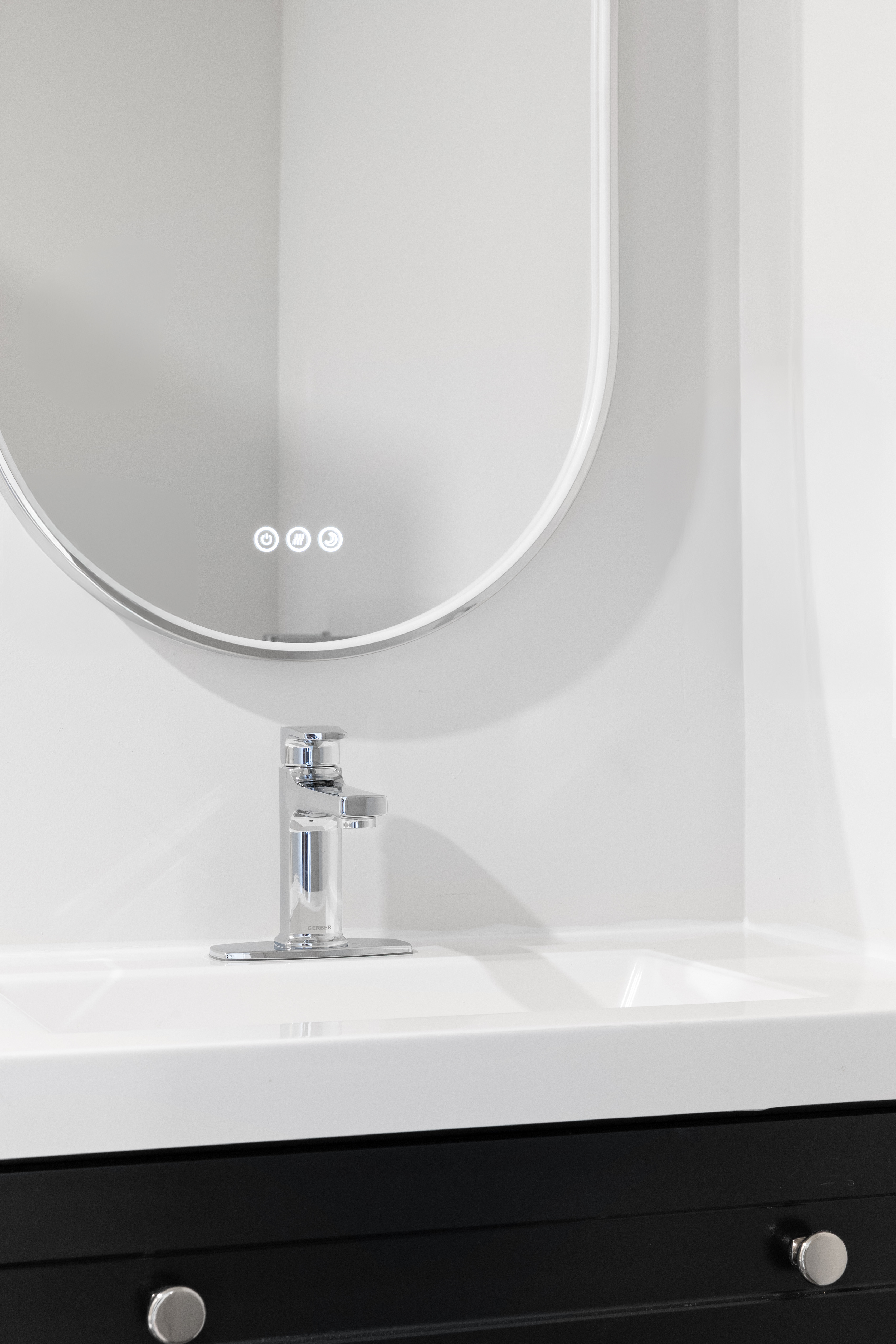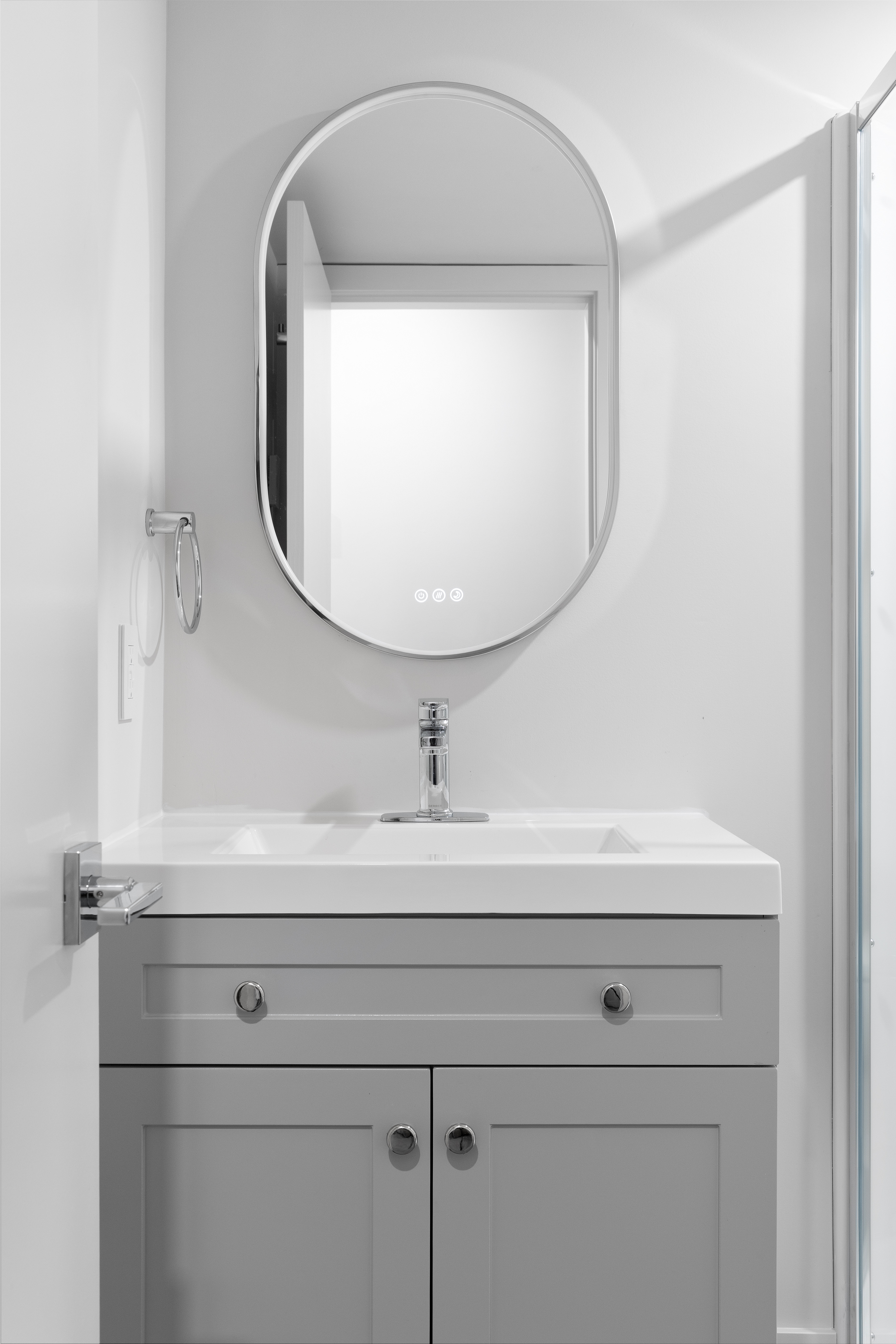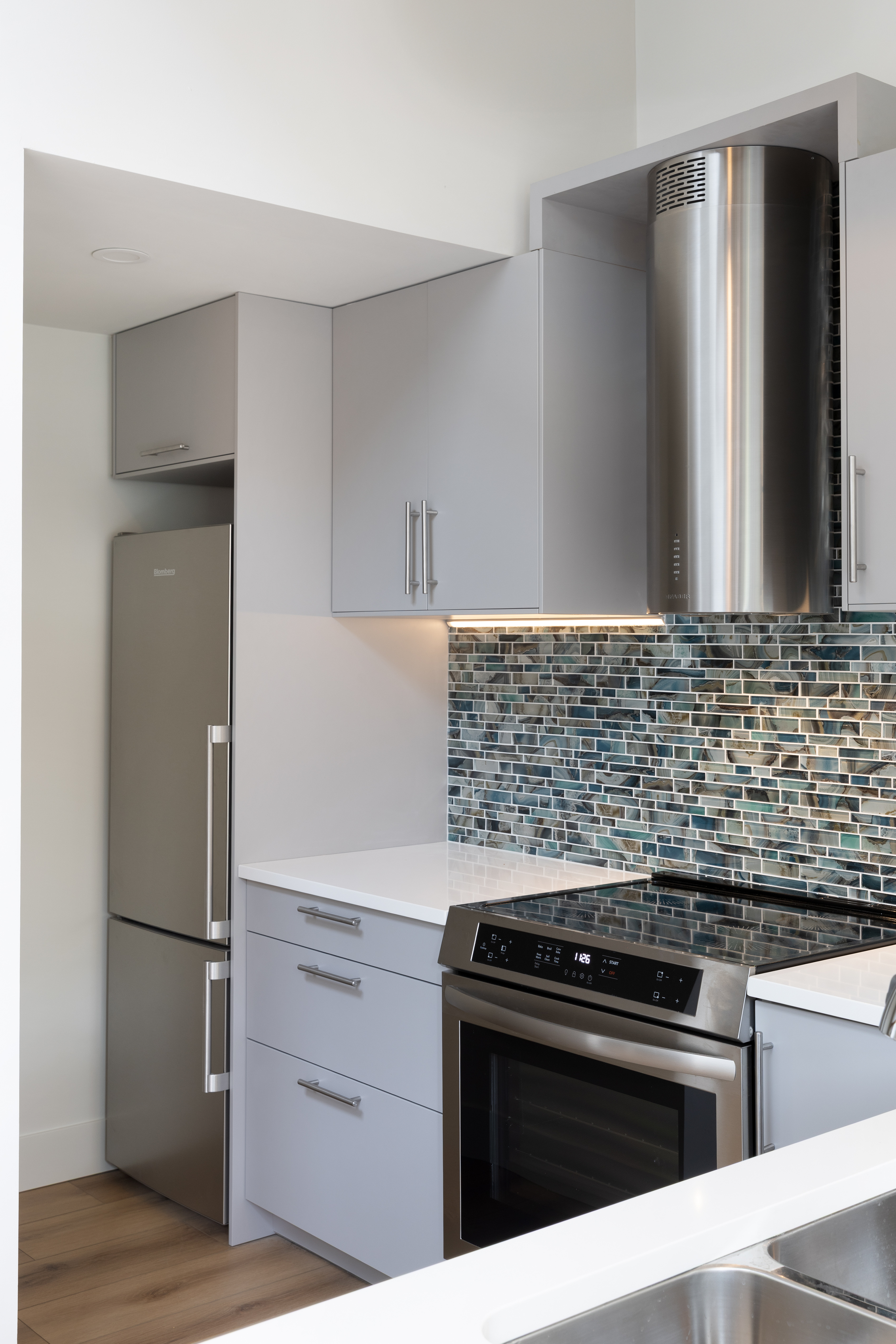 A new IKEA kitchen and bathroom vanities were installed by Schreyer Construction’s in-house team, complemented by quartz countertops, stainless steel appliances, a tiled backsplash, and new plumbing fixtures.