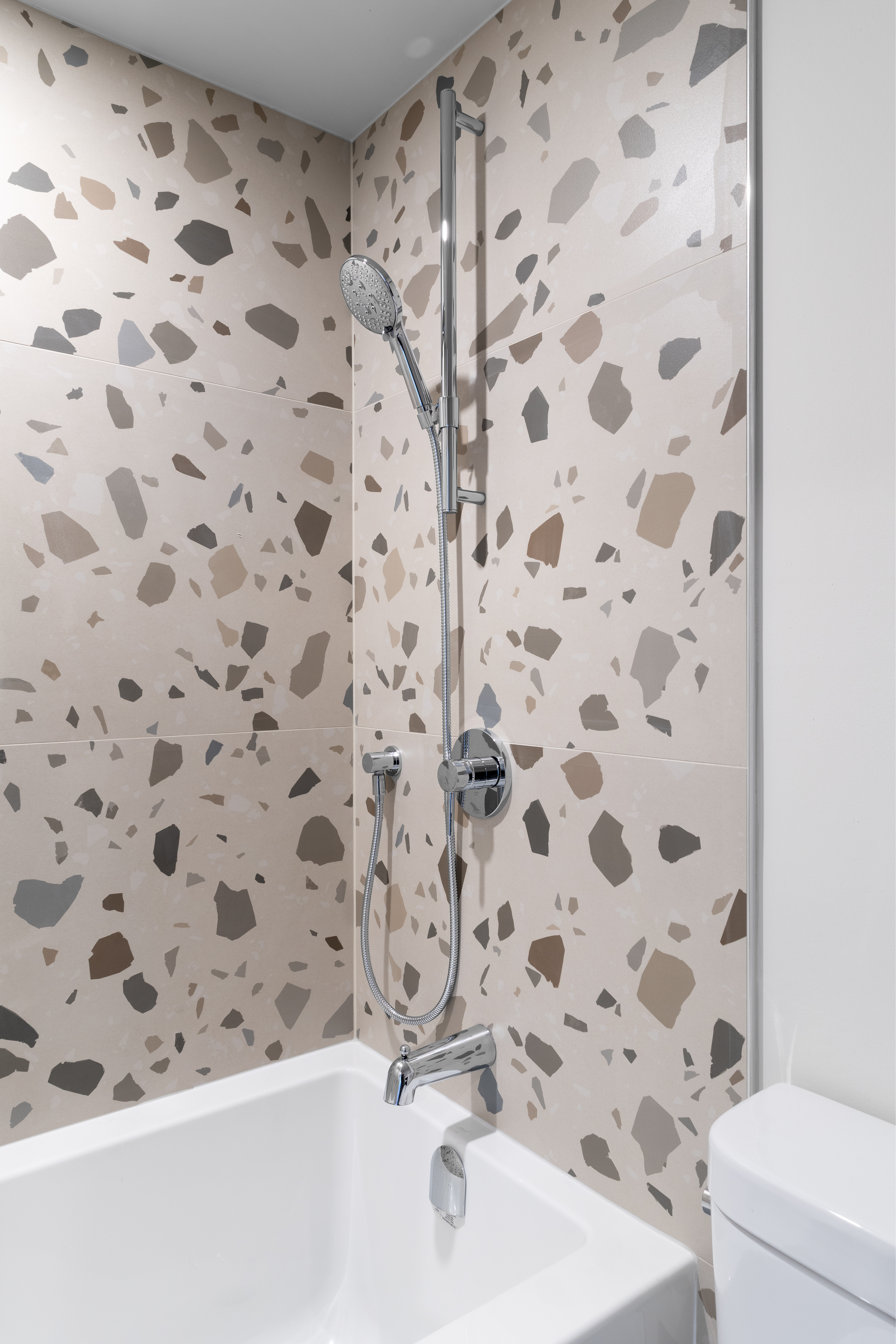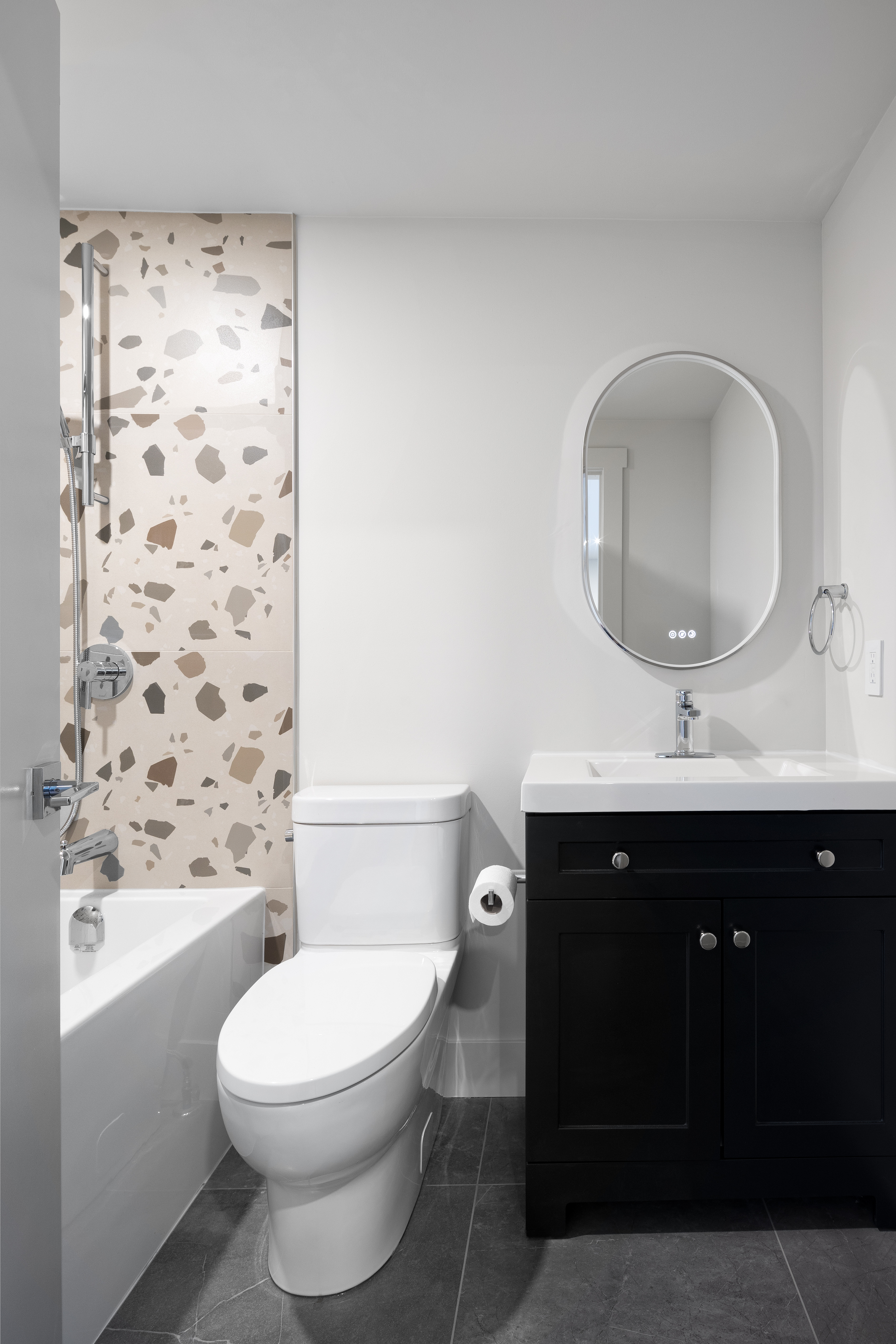 All three bathrooms, the kitchen, and the laundry room were fully renovated. High-quality shower inserts were used in two bathrooms to manage costs, while the main floor bathroom features a tub and shower with a decorative tile surround.